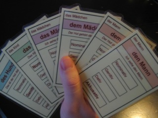 Das Quartett besteht aus 24 Karten. Jede Karte ist einzeln laminiert und 10,5 cm x 7,5 cm gross. 4 Karten zusammen bilden ein Set. Zu folgenden Nomen gibt es ein Set: die Frau, der Mann, das Kind, der Hund, die Dame, das Mädchen. Bei jedem Set kommt jeder Fall (Nominativ, Genitiv, Dativ, Akkusativ) einmal vor. Das Ziel ist, ein vollständiges Set ablegen zu können.
